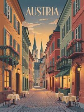 Colorful buildings line a quiet street in Austria, featuring inviting cafes with checkered tablecloths. The scene captures a serene sunset, highlighting church spires in the background.