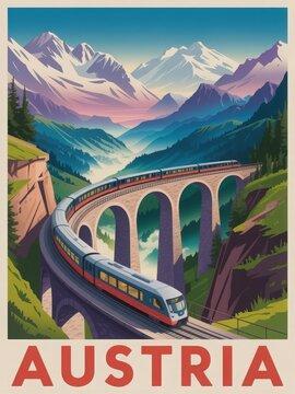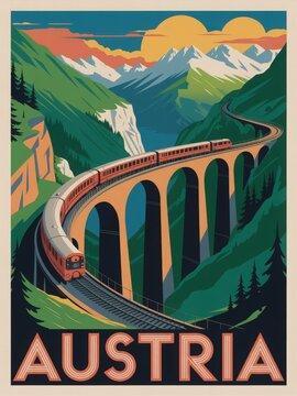 A vibrant scene captures a train winding across a tall viaduct in the Austrian mountains. Below, lush greenery meets rocky cliffs as the sun sets behind majestic peaks, creating a breathtaking view.