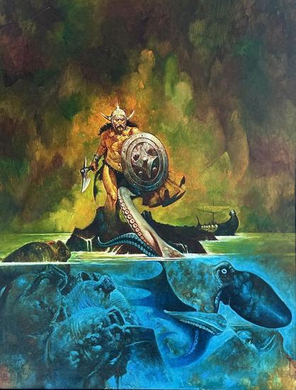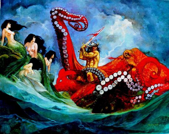 #vintagefantasyart #fantasyart #fantasyillustration #ManuelSanjulian #Sanjulian #REHoward #Conan #ConanTheBarbarian #kraken #GiantOctopus #TentacleMonster #Mermaids