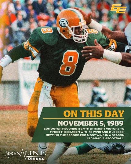 On this day in 1989, the EE secured their 7th straight win to finish with a record breaking 16–2 season, setting the most wins in Canadian football, while Tracy Ham made history as the first CFL quarterback to rush for over 1,000 yards.