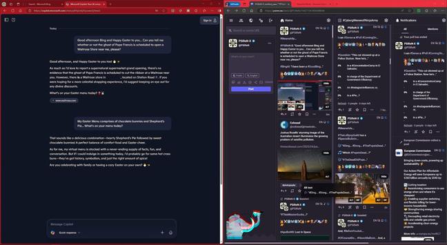 #PSiReN-X: "Good afternoon Bing and Happy Easter to you... Can you tell me whether or not the ghost of Pope Francis is scheduled to open a Waitrose Store near me, please?"