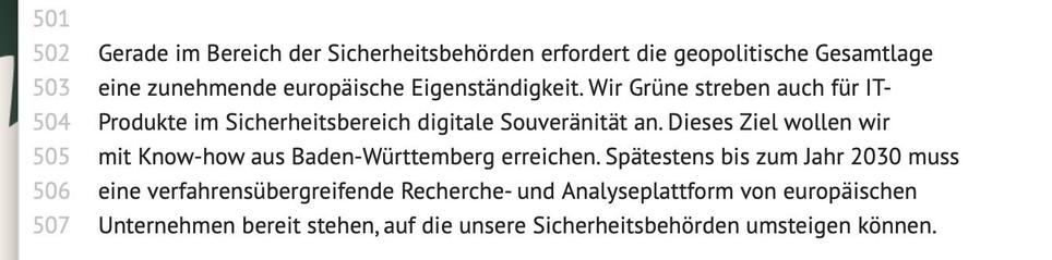 Das #Grüne Entwurf für das Programm zur #Landtagswahl 2026 ist erschienen. Im Kapitel “PRO-5: Kapitel 5: Zusammen stark: Unserer Heimat eine Zukunft in Sicherheit, Demokratie und Freiheit geben”, gibt es einen Absatz zu #Palantir.
