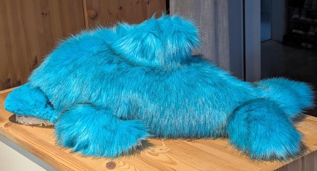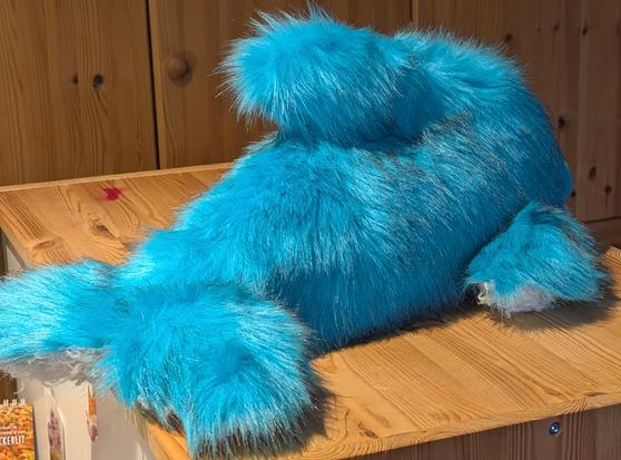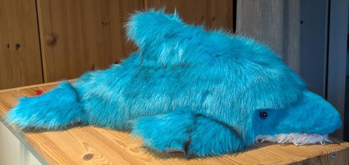 In 10 hours of loving handiwork, I crafted this 65 cm long, cuddly, one-of-a-kind dolphin with shimmering purple eyes and a movable mouth. It is made almost entirely from leftover materials – a sustainable, unique piece that will not only make you happy, but also a charitable organization!