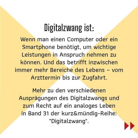 Stell dir eine Welt vor, in der dein Bahnticket nur noch online verfügbar ist und Arzttermine nur noch online buchbar sind... kommt dir bekannt vor? Dieses Problem wird immer präsenter und nennt sich Digitalzwang. Was genau damit gemeint ist und welche Einschränkungen Euch drohen, erfahrt ihr in Band 31 der Reihe #kurzundmündig
