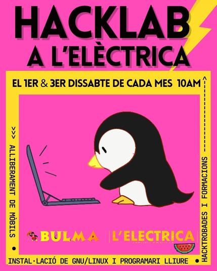 Cada primer i tercer dissabte del mes a les 10h ens trobam amb BULMA al Hacklab en l’Ateneu Popular L’Elèctrica per conspirar, desobeir i reapropiar-nos de les eines digitals.