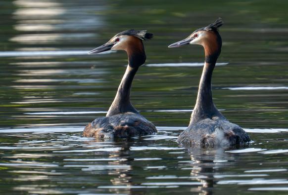 Two Great Crested Grebes (Podiceps cristatus) performing their stunning courtship dance on the water.