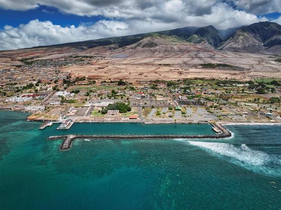 People often ask if Lahaina has recovered and has been re-built. The answer is no. Progress has been slow. We took a few drone photos from the water last month. This is Lahaina Harbor, with the famous banyan tree and Front Street.