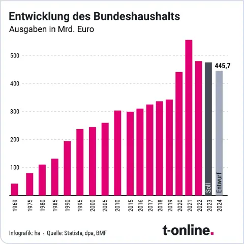 Zur Gegenüberstellung: Eine andere Grafik von t-online zeigt die Entwicklung des #Bundeshaushalts im Zeitraum von 1969 bis 2024. Trotz der zuletzt starken #Inflation und Mehrausgaben durch den #Krieg in der #Ukraine liegen die Ausgaben unter denen der #Corona-Jahre.