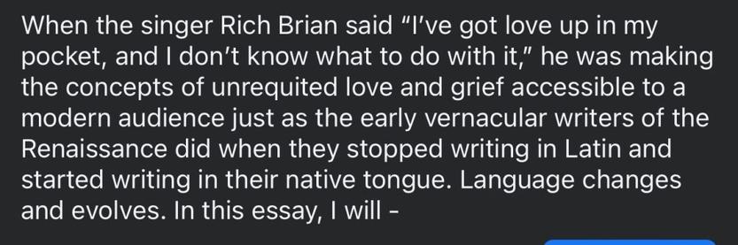 In conclusion, the next time you’re tempted to scoff at modern popular music and social media culture, ask yourself what themes these creators are trying trying to convey to their audience in the artist’s (and the audience’s) vernacular instead. Unrequited love? Grief? Wonder? Anger? Language changes and the way information is shared changes, people, and writing in one’s own vernacular as well as the free spread of information itself is a proud, rebellious tradition that helps the common people break free from oppression and fear.