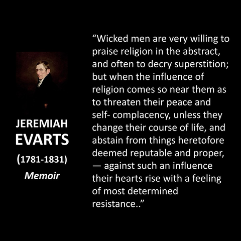 Jeremiah Evarts led the American Board of Commissioners for Foreign Mission. He says wicked men will praise religion until they are asked to refrain from something. Of course, we say.