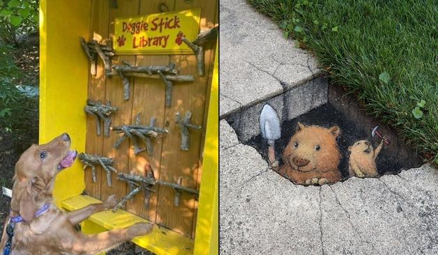 This collection brings together smart and surprising ideas from different places: a Doggie Stick Library, a painted illusion in Indiana, a skull pushing through a wall in an abandoned site, a fragmented traveler sculpture in Italy, an octopus mural in Vancouver, a deep 3D piece in Mexico, a small Oakoak intervention in France, a full-building ship mural in Brussels, a geometric bench in Luxembourg, and a tiny creature scene hidden in a sidewalk crack. More: Clever Signs (9 Photos) 1. Doggie […]