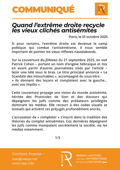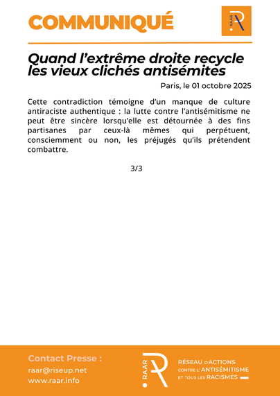 Retrouvez notre communiqué complet sur notre site : https://raar.info/2025/10/quand-lextreme-droite-recycle-les-vieux-cliches-antisemites/ (Quand l’extrême droite recycle les vieux clichés antisémites)