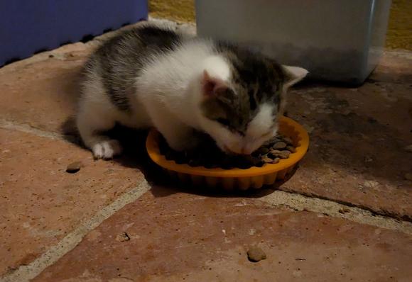 Gestern Abend hat sich eins der Katzenbabies in die Schüssel mit dem Trockenfutter für die erwachsenen Katzen reingestellt und mal probiert, ob es diese harten Teile zerbeißen kann.