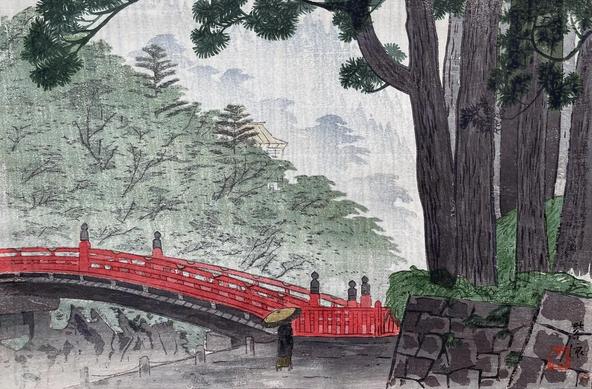 https://www.visitnikko.jp/en/spots/shinkyo-bridge/ #ShinHanga #Art #KasamatsuShiro #Showa #Rain #NikkoShinkyo #FutarasanJinja #DaiyaRiver #Nikko #Japan