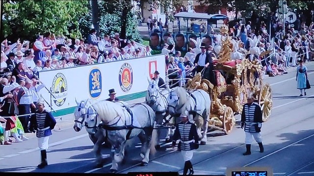 #Oktoberfest #Wiesn Trachten- und Schützenzug 2023 - Ein #Highlight: Die "Goldene Kutsche" von König Ludwig II. aus dem Jahr 1870/1871 (Aus dem Nymphenburger Marstall - Ein Nachbau). "Der #Kini, er lebt!" 👑