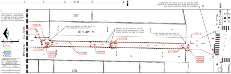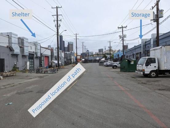 The design drawing shown at the Seattle Bicycle Advisory Board (“SBAB”) October meeting shows a 15-foot-wide bike path between two fences. However, the presenter said the design was progressing and might not include the east fencing at all, since the shelter currently only uses those buildings for storage. The drawing lists that fence as “optional.” SBAB members noted the concern that fences on both sides, especially opaque ones like the fences currently installed, may not feel comfortable for users. Because the shelter is a King County project, the county is ultimately responsible for moving the fencing while SDOT is funding the design and bikeway install.