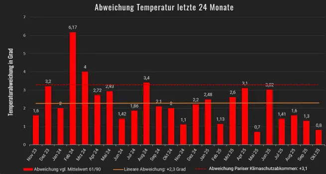 Der Oktober 2025 war der 50. Monat in Folge, welcher zu warm war (Abweichung ≥ 0)