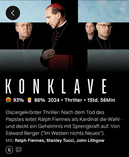 Liegt evtl daran, dass der Film nur funktioniert, wenn man die Katholische Kirche iw akzepiert. Dann haut einem der Twist um. Mich aber widert es an, dass normalität eine Wendung im Sinne der Handlung darstellt. Auch die Miniwendung um Kardinal Adeyemi hat mich nur noch angekotzt.