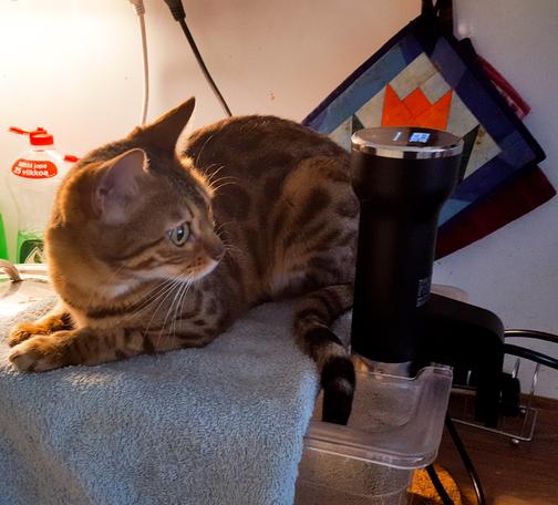 I gave a new kitten-size Kickeroo toy to the cats as a present. It was mostly for Mort, who loved this particular color and size from the bottom of her tiny kitty heart, and then her sister Lobsang vengeance-piddled on it.