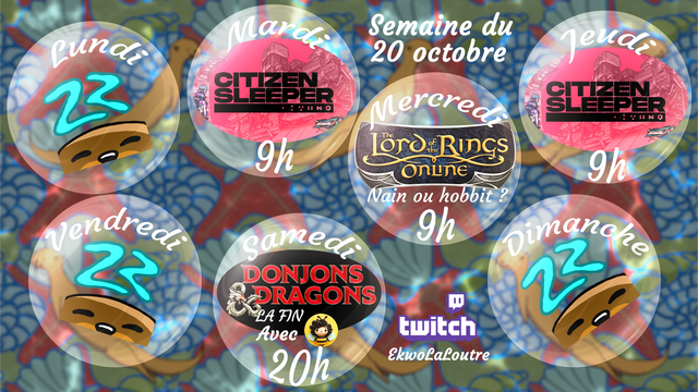 Cette semaine, un nouveau jeu ร faire : Citizen Sleeper. Il ne prendra pas beaucoup de sessions ร priori (environ 3 ou 4). Puis nous aurons notre classique LotRO et, enfin, LA FIN de l'aventure jdr ! (Et stream 12h ๐ la semaine d'aprรจs !)