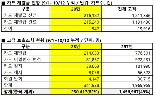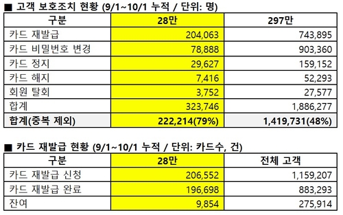 Lotte Card has completed protection measures for 220,000 customers after a hacking incident, with 80,000 card cancellations and no confirmed fraud losses to date.