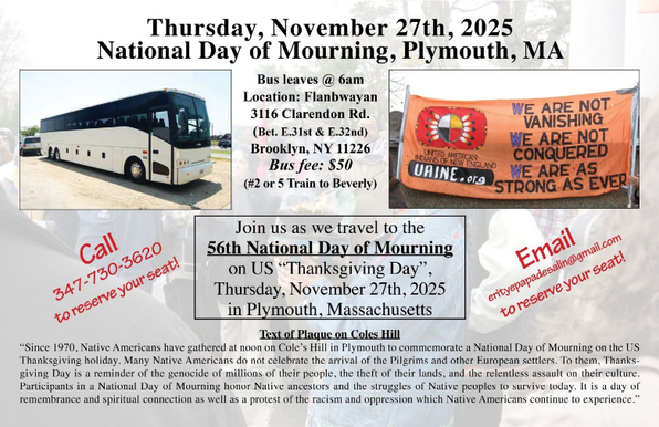 "Since 1970, Indigenous people & their allies have gathered at noon on Cole's Hill in Plymouth to commemorate a National Day of Mourning on the US Thanksgiving holiday. Many Native people do not celebrate the arrival of the Pilgrims & other European settlers. Thanksgiving Day is a reminder of the genocide of millions of Native people, the theft of Native lands and the erasure of Native cultures. Participants in National Day of Mourning honor Indigenous ancestors and Native resilience. It is a day of remembrance and spiritual connection, as well as a protest against the racism and oppression that Indigenous people continue to experience worldwide."