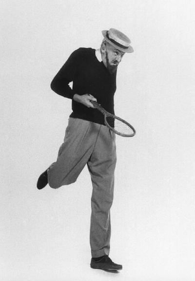 Jacques Tati miming/playing with tennis racket.