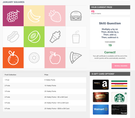 Playing the monthly Vitality Squares fruit matching game is the closest thing to free money you get from Vitality. It’s only worth about $28/year (based on the odds of matching more than 3 fruits), but it’s fun to play.