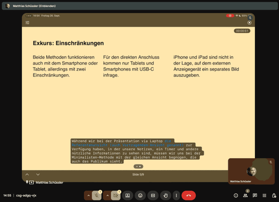 Die PrĂ€sentation via iPad und Google Meet: Die Elemente der BenutzeroberflĂ€che bleiben sichtbar, ebenso, falls eingeschaltet, die Notizen fĂŒr den Referenten.Beide Methoden funktionieren mit dem Smartphone oder Tablet, allerdings mit zwei EinschrĂ€nkungen: