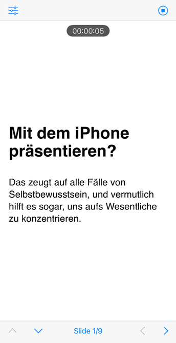 Also, nach dem jetzigen Stand der Dinge ist es nicht verkehrt, PrĂ€sentationen wie gewohnt via Laptop abzuhalten. Das heisst nicht, dass die mobile Variante der Presenter-App ĂŒberflĂŒssig wĂ€re. Im Gegenteil: Um die PrĂ€sentationen aufzusetzen und zu bearbeiten, finde ich sie hervorragend. Sie lĂ€dt dazu ein, unterwegs und ohne Ablenkung an seinen Ideen zu arbeiten.