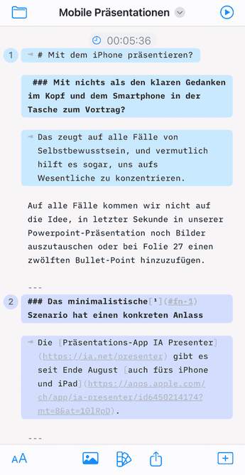 Die Bearbeitungsansicht am iPhone. Die Gliederung der Folien erfolgt per Markdown.Denn das auf Einfachheit getrimmte Konzept von Presenter funktioniert am Handy-Display perfekt. Wir arbeiten nicht in einer visuellen Umgebung, sondern in einer Textverarbeitung. In der erfassen wir unseren Vortrag als fortlaufendes Manuskript. Die Folien entstehen anhand einer simplen Gliederung, die wir mittels Markdown-Formatierungen bestimmen: