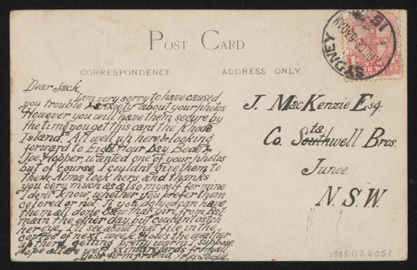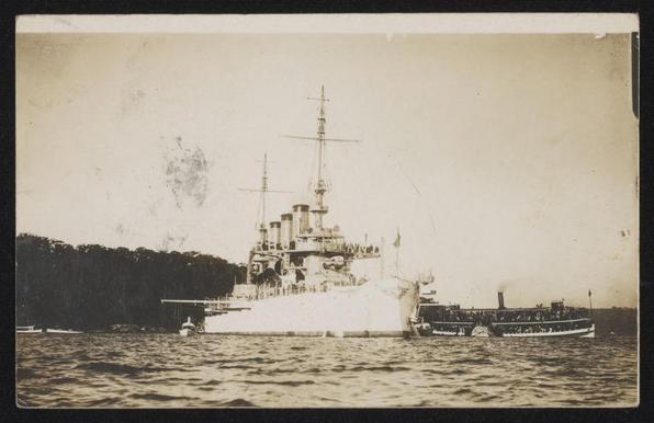 A postcard featuring a black and white photograph of a ship with a paddle steamer beside it. A handwritten note is on the back of the postcard along w…