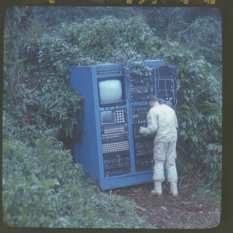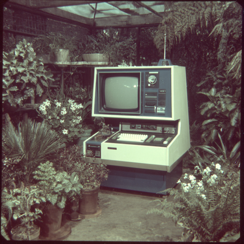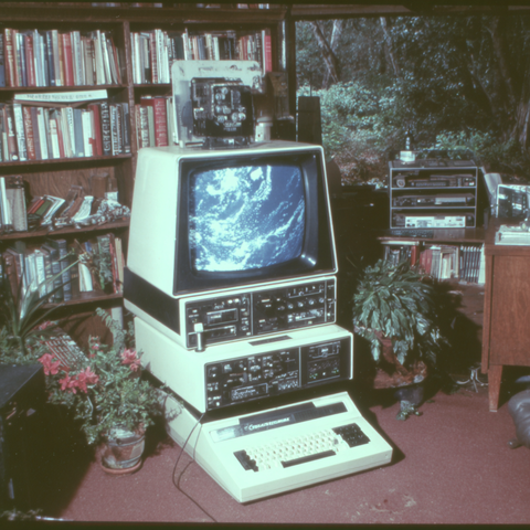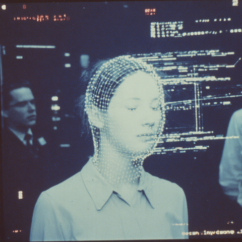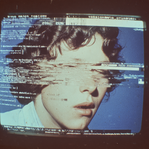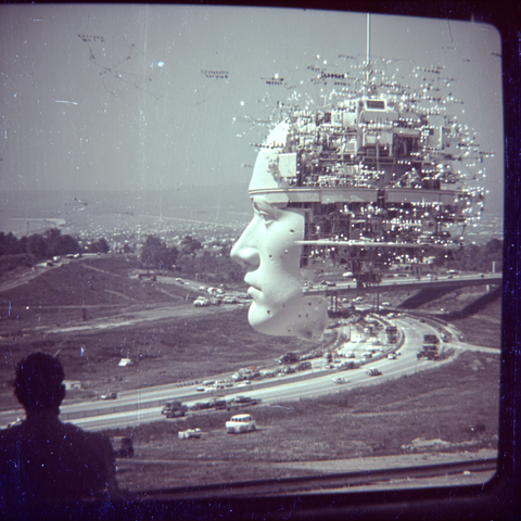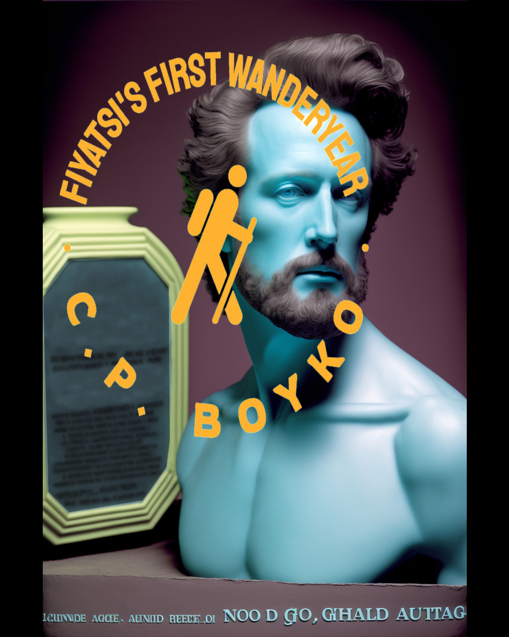 A series of abstract flowers with fluffy, rounded tops stands out against a colorful wavy backdrop. The flowers are in white, yellow, and orange, creating a striking visual contrast.