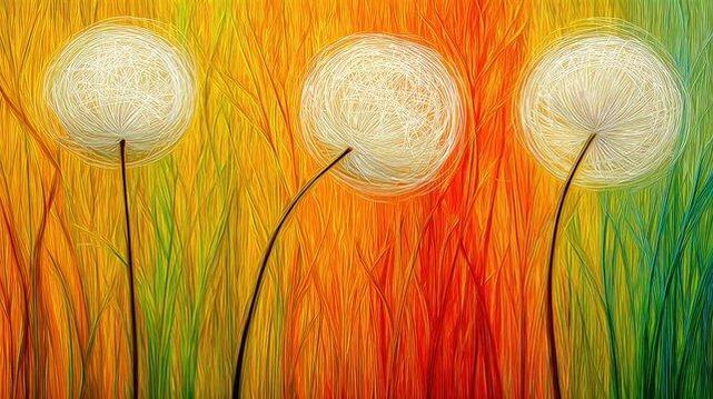 Three vibrant dandelions with fluffy white heads rise against a radiant background of orange, yellow, and green hues. The warm colors create a lively, cheerful atmosphere capturing natures beauty.