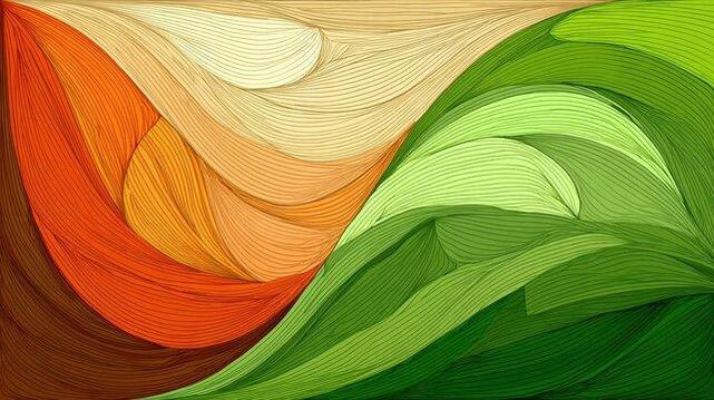 Colorful waves in warm orange and cool green tones create an abstract representation of nature. The smooth lines flow gracefully, showcasing the harmony between land and sky.