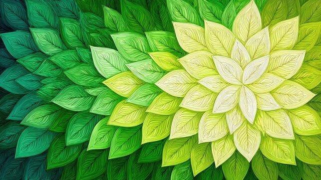 A vibrant arrangement of leaves in various shades of green and yellow creates a textured pattern. The layers of leaves blend together, showcasing natures beauty and diversity.