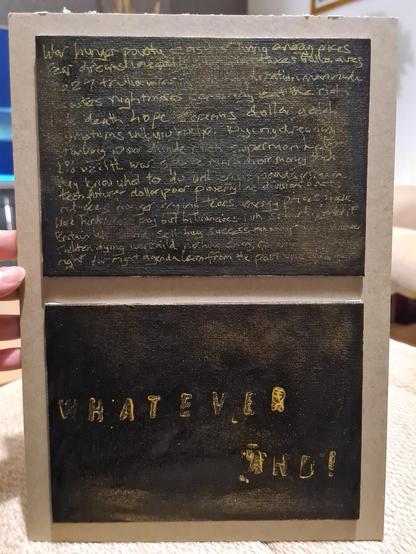 Playing about with text to do with the value on wealth theme. Gold pen and acrylic paint on 2 small canvas boards on a4 backing.