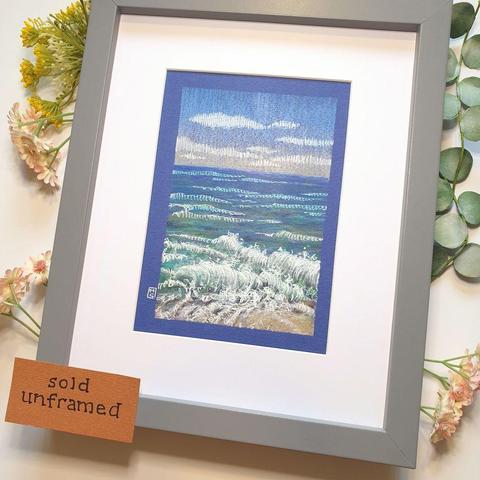 A little seascape on a breezy day with waves lapping up on the edge of a beach. This is 5 by 7" and will be easy to DIY frame in a standard photo frame.