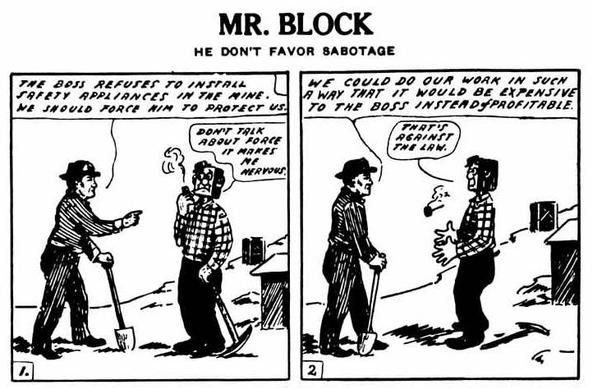 Today in Labor History November 7, 1912: Ernest Riebe's "Mr. Block," IWW labor comic strip first appeared in print. Mr. Block was one of the best-loved features in the Wobbly press. Joe Hill wrote a song about "Mr. Block," who was a boss-loving, American Dream-believing, self-sabotaging knucklehead. Some call Riebe the first "underground" comic book artist.