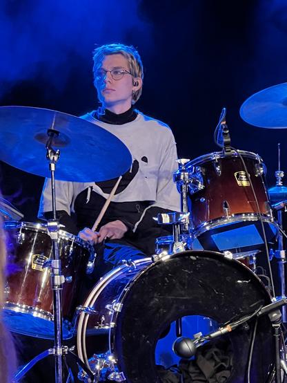 The Drum Kid on his drum kit doing his thing and rocking a Ziggy Stardust vibe.
