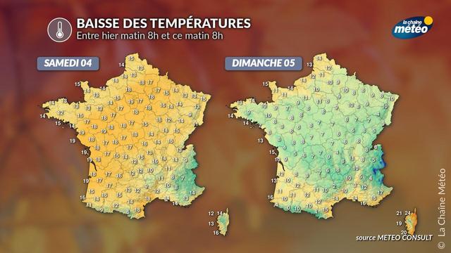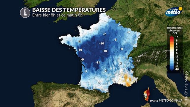 🌡️Baisse généralisée des températures ce matin par rapport à hier où on perd entre 5 et 10°C. Une baisse liée à l'arrivée d'une masse d'air d'origine #polaire sur le pays, d'où la #neige observée dès 1500 mètres dans le nord des Alpes.