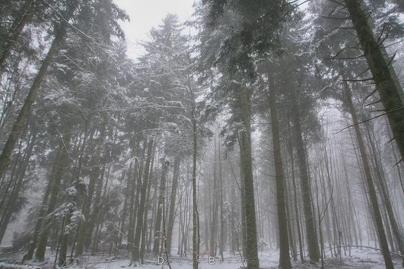 Ambiance hivernale au creux de la forêt vosgienne. Le brouillard rajoute à cette atmosphère féerique de bois enneigé. Les pins se dressent vers le ciel avec une rigueur géométrique déconcertante.