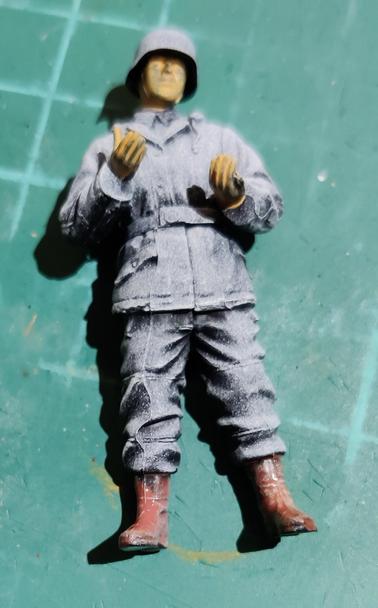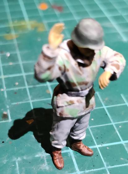 I started my attempt in painting my grayscaled little Germans in living colour: first a thin layer of VMC Middle Fleshtone, whatever that is, and some AK's Mahogany on their boots. I hope my VMC Chocolate Brown isn't dried up yet, it'd be a more suitable shade for boots.