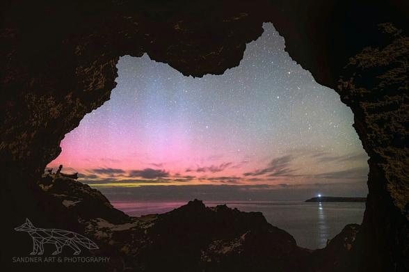 A glow of pink and violet aurora drifts across the night sky, framed perfectly by the silhouette of the cave opening and the quiet sea beyond