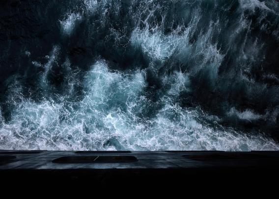 Image taken from Queen Mary 2 as it sails through the North Atlantic. The perspective highlights the stark contrast between the ship's structure. For me, the sea has a strange and deadly effect that invites to go in the water - perhaps like the sirens of mythology.
