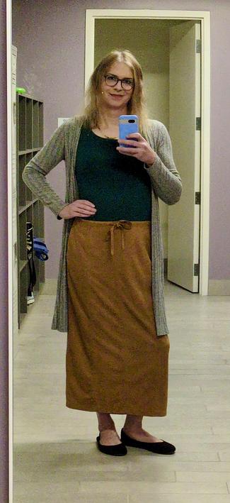 Work outfit of the day. It's chillier, but the skirt is a nice warm material. I feel a little bit like a skittle color-wise (taste the rainbow!), but we can't all ace our outfits every day, lol.