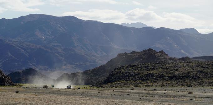 Returning from paddling down the #OrangeRiver which is at the base of the tall mountains in the background. For the record, this is the rainy season - you can see little patches of small green plants.