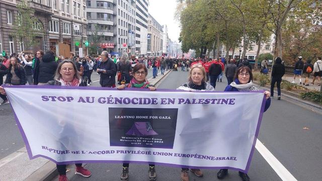Esta mañana, el Campamento de Mujeres por la Paz ha estado presente en la enorme manifestación que ha tenido lugar en Bruselas, coincidiendo con su huelga nacional contra los recortes anunciados por el gobierno de coalición.