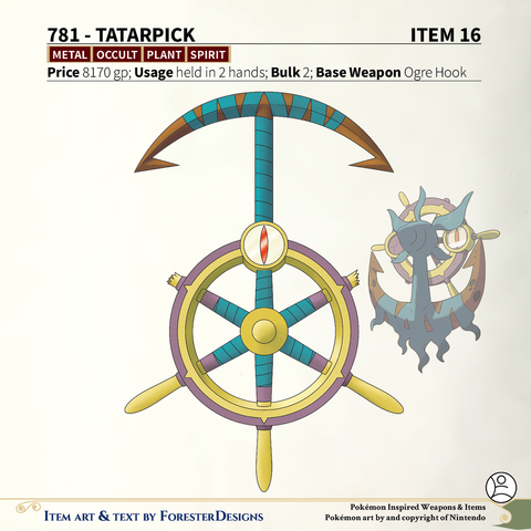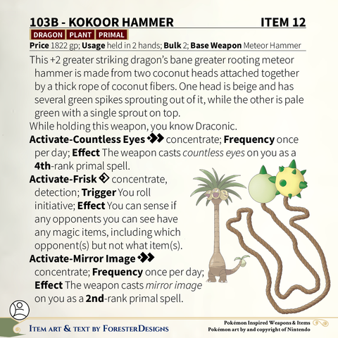 A #PF2e conversion of my older #Pokemon #MagicItems, with a #Dhelmise #OgreHook to hold things in place, & an Alolan #Exeggutor #meteorhammer to give you so many eyes!