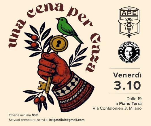 #MutuoAiuto #PianoTerra #CenaSociale #cibo #convivialità #gaza #palestina #ApeMilano #benefit #brigatalia